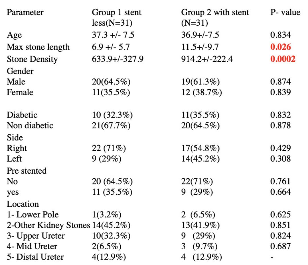 The two groups were compared regarding demographic factors, stone characteristics, procedural outcome (UTI, ER Visits, Admission, and Re-Intervention within 30 days of procedure).