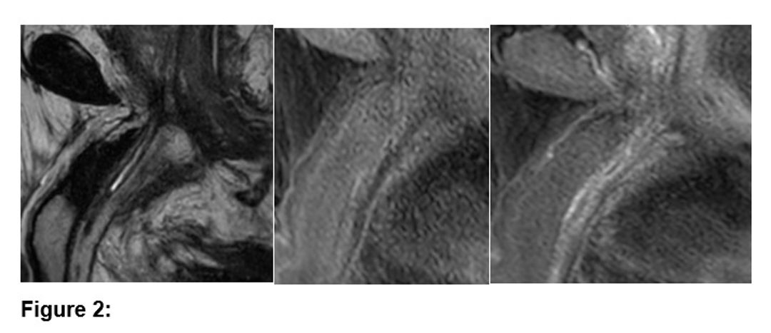 1. Case 1: A 62-year-old male with recurrent urethral strictures after-coronary bypass surgery and internal urethrotomy. MRI revealed complete occlusion of the distal prostatic urethra and partial stenosis in the proximal bulbous urethra. Anastomotic urethroplasty was successfully performed, excising a 2 cm fibrotic segment.