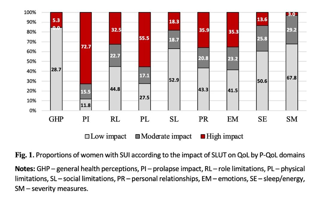 The results of this study confirm a significant negative impact of SUI on various dimensions of QoL, especially in women with coexisting OAB symptoms. Patients with OAB demonstrated worse scores in physical health domains, pelvic floor distress, and urinary symptom severity. Additionally, they experienced higher levels of anxiety, depression, and abdominal pain, further contributing to their impaired well-being. Despite no significant differences in sexual function, overall functional limitations were more pronounced in the OAB group. Importantly, the P-QoL questionnaire showed high internal consistency and strong correlation with established instruments (e.g., ICIQ-SF), validating its use in assessing QoL in SUI populations. These findings support the need for a comprehensive, symptom-specific assessment approach in women undergoing evaluation for surgical treatment of SUI, especially those presenting with OAB features, to guide clinical decision-making and improve patient outcomes.
