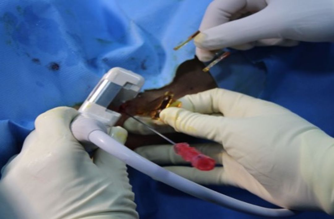 The needle entry for the PCNL procedure is usually guided by fluoroscopy. The standard method uses the Bull's eye technique or carnio-caudal technique. Using USG guidance for percutaneous access for PCNL is a well-established, safe, and effective method. (1) Some urologists use ultrasound guidance for the entry. Standard probes have an external needle guide, which may target 35 to 45’. This high-degree angle makes it difficult to align with the calyceal axis. Our novel method involved a hockey stick-shaped special convex probe with a needle guide at a 5’ and 25’ angle to make perfect and easy calyceal punctures.