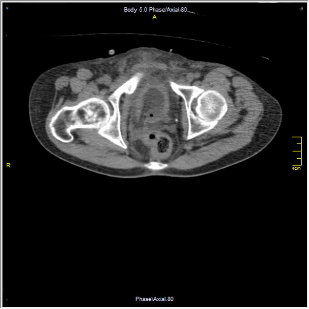 A 23-year-old male with a history of traumatic spinal cord injury (T3 ASIA A), iatrogenic urethral stenosis limiting clean intermittent catheterization (CIC), and low bladder capacity, was admitted for a planned open cystostomy and bladder stone extraction. Following stone removal, a 24-French SPC was placed. On postoperative day 3, the patient developed AD, characterized by hypertensive urgency and profuse sweating. Renal ultrasound revealed right-sided hydronephrosis. A CT scan confirmed SPC misplacement, with the catheter tip located inside the right distal ureter.