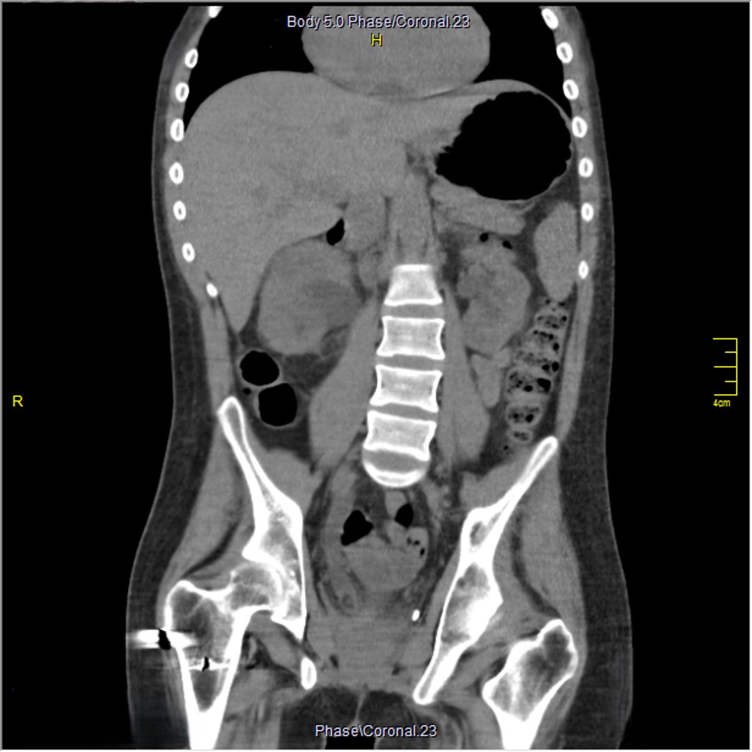 Figure 2 Coronal view of the SPC's tip in the distal right ureter provoking hydronephrosis
